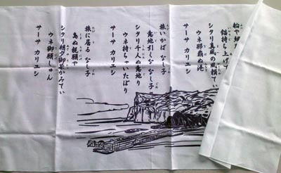 白手拭いの中央部分(四辺より2~5cm内側)にプリントします。ベタの強いデザインはプリントできません。数が少ない場合割高になります。版代が別途かかります。