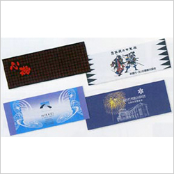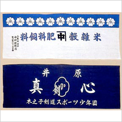 白手拭いの中央部分(四辺より2~5cm内側)にプリントします。文字でもベタの強いもの(1cm以上の太さ)や長い直線、ベタの強いデザインのものになります。版代が別途かかります。